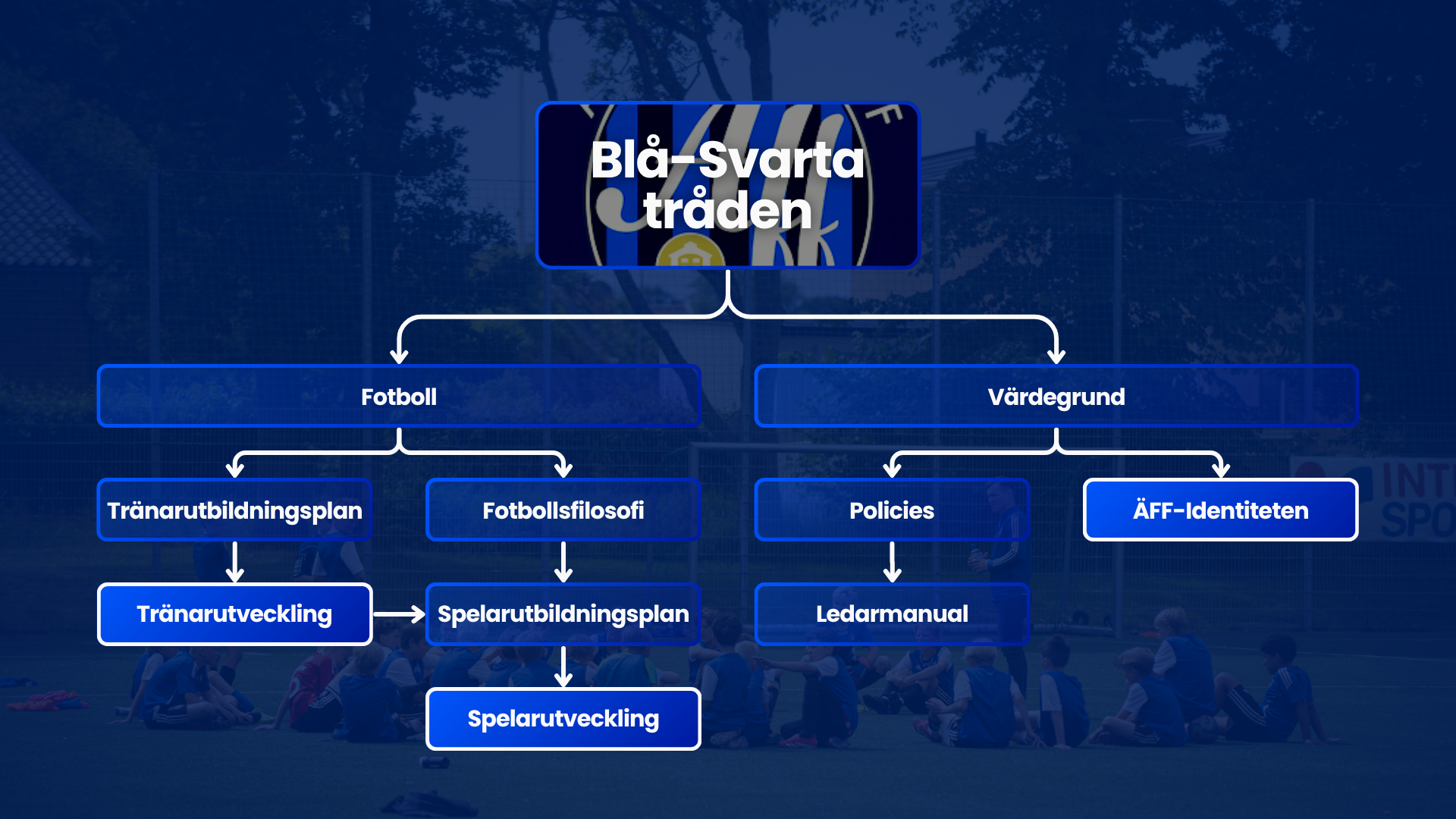 Den Blå-Svarta tråden beskriver den övergripande strukturen för hur vår verksamhet är organiserad och bedrivs. Den fungerar som en gemensam riktlinje för att främja tränarutveckling, spelarutveckling och en tydlig ÄFF-identitet i hela föreningen, och är uppdelad i två huvudområden: